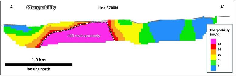 Ein 3,5 km² großes IP-Anomalienfeld mit hoher Ladbarkeit (Chargeability) wurde beim M5-Ziel entdeckt – ein bislang völlig ungetestetes Gebiet, das sich direkt entlang des Trends zum „Gate Discovery“ von Kodiak Copper befindet.