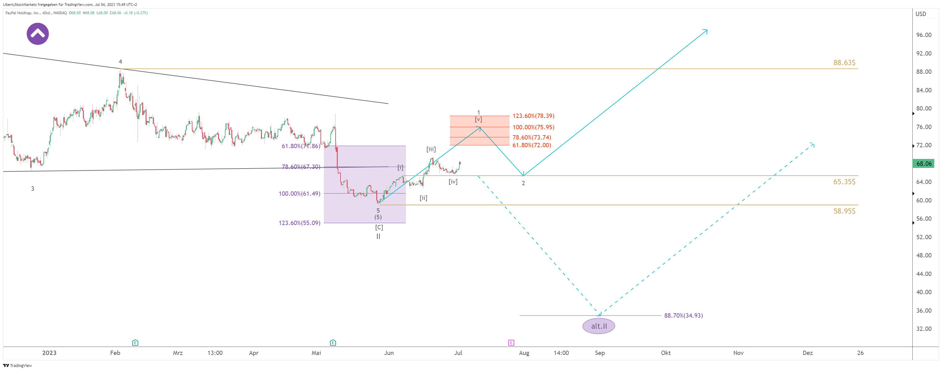 Sollte PayPal allerdings jetzt schon die Luft ausgehen und frühzeitig – vor Erreichen unserer roten Box im Chart bei 72,00$ bis 78,39$, die 65,35$ unterschreiten, müssen wir mit einer Ausdehnung der Korrektur bis auf etwa 34$ rechnen. Wir sind gespannt.
