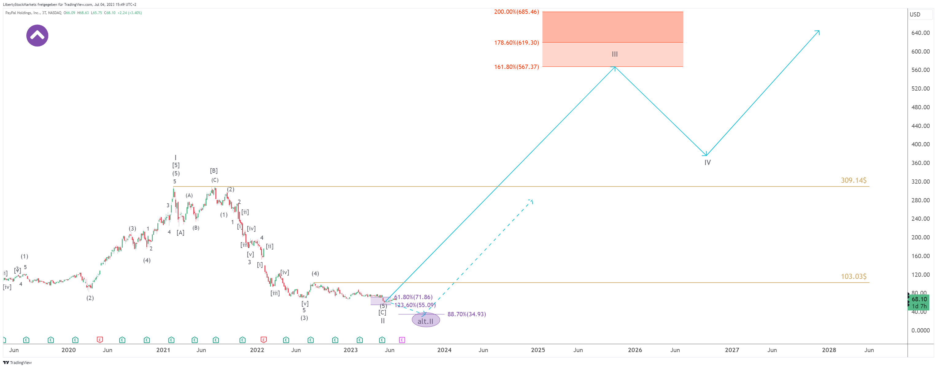Wir erwarten, dass PayPal jetzt oder erst nach Erreichen der 34$ ein Anstieg bevorsteht, der weit über das bisherige Allzeithoch hinausgeht. Stand heute, können wir uns langfristig Kurse im Bereich unserer roten Box oben im Chart bei 567,37$ bis 685,46$ gut vorstellen. Ein ordentliches Potential, das wir uns nicht entgehen lassen wollen.