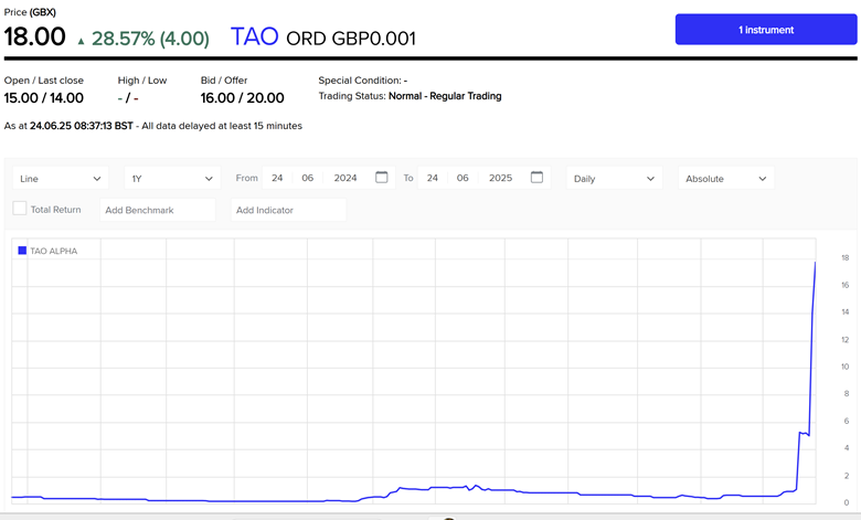 TAO Alpha PLC (LSE: TAO) – stieg am 17. Juni um +1,800 %, nach Ankündigung einer £5M-Finanzierung und Bitcoin-Treasury