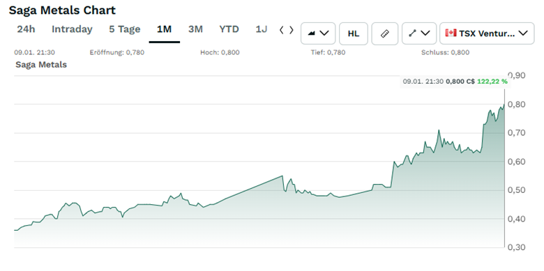 Saga Metals hat soeben bei 0,81 CAD auf einem neuen Allzeithoch geschlossen und damit eine Bewegung fortgesetzt, bei der sich die Aktie in kaum mehr als einem Monat mehr als verdoppelt hat — und das aus einem ganz einfachen Grund: