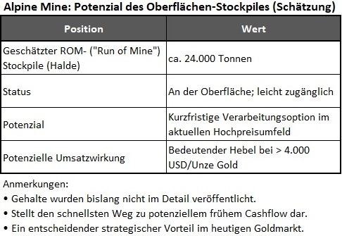- Und – entscheidend – geschätzten 24.000 Tonnen mineralisiertem Haldenmaterial („stockpile“) direkt an der Oberfläche.