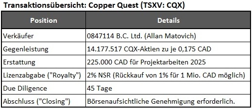 - Mit einem neuen Großaktionär mit echtem Engagement: Allan Matovich und seine Partner erhalten 14,18 Mio. Aktien und halten damit fast 20% an Copper Quest.