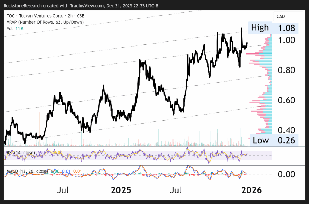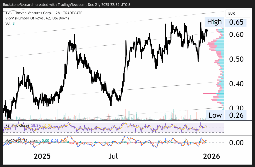 Offenlegung von Interessen und rechtliche Hinweise: Nichts in diesem Bericht ist als Aufforderung zum Kauf oder Verkauf von Wertpapieren auszulegen. Rockstone, seine Eigentümer und der Autor dieses Berichts sind keine registrierten Broker-Dealer oder Finanzberater. Bevor Sie in Wertpapiere investieren, sollten Sie stets Ihren Finanzberater und einen registrierten Broker-Dealer konsultieren. Treffen Sie niemals eine Investitionsentscheidung ausschließlich auf Grundlage von Online- oder Druckberichten, einschließlich Berichten von Rockstone – insbesondere, wenn es sich um kleine, wenig gehandelte Unternehmen handelt. Der Autor dieses Berichts, Stephan Bogner, erhielt von Tocvan Ventures Corp. eine Vergütung in Höhe von 19.000 CAD für einen Zeitraum von 3 Monaten. Zudem hält er Wertpapiere von Tocvan und wird daher auch von einem Handelsvolumen- und Kursanstieg profitieren. Dies stellt einen erheblichen Interessenkonflikt dar, der die Objektivität dieser Berichterstattung beeinflussen kann. Der Autor kann die Wertpapiere jederzeit ohne Ankündigung handeln; dadurch können weitere Interessenkonflikte entstehen. Dieser Bericht ist als werbliche Veröffentlichung zu verstehen und ersetzt keine individuelle Anlageberatung. Alle Angaben entsprechen dem Stand zum Zeitpunkt der Veröffentlichung und können sich ohne Vorankündigung ändern. Eine Haftung für finanzielle Verluste, die durch Investitionen aufgrund dieses Berichts entstehen, ist ausgeschlossen. Die Ansichten von Rockstone und des Autors in Bezug auf die in den Berichten vorgestellten Unternehmen spiegeln ausschließlich die eigenen Einschätzungen wider und basieren auf Informationen aus öffentlichen Quellen, die als zuverlässig gelten. Rockstone und der Autor haben keine unabhängige Due-Diligence-Prüfung vorgenommen. Weder Rockstone noch der Autor garantieren die Genauigkeit, Vollständigkeit oder Nützlichkeit des Inhalts, noch dessen Eignung für bestimmte Zwecke. Ebenso gibt es keine Garantie, dass die erwähnten Unternehmen sich wie erwartet entwickeln oder dass vorgenommene Vergleiche mit anderen Unternehmen zutreffen. Bitte lesen Sie den vollständigen Disclaimer sorgfältig. Sollten Sie damit nicht einverstanden sein, nutzen Sie weder diese Website noch den Bericht. Durch die Nutzung der Website oder dieses Berichts erklären Sie sich mit dem Disclaimer einverstanden, unabhängig davon, ob Sie ihn vollständig gelesen haben. Die bereitgestellten Informationen sind allgemeiner und bildender Natur. Daten, Tabellen, Abbildungen und Bilder, sofern nicht anders gekennzeichnet oder verlinkt, stammen von Tradingview.com, Stockwatch.com, Tocvan Ventures Corp. und öffentlich zugänglichen Quellen.