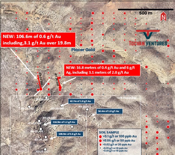 Tocvans neue Gold-Entdeckung befindet sich 250 m nordwestlich vom Bohrloch JES-24-79 (42,7 m @ 1 g/t Gold; bereits 2024 bekanntgegeben), sowie 185 m nordöstlich von Bohrloch JES-24-102 (16,8 m @ 0,4 g/t Gold und 6 g/t Silber inkl. 3,1 m @ 2 g/t Gold; heute bekanntgegeben).