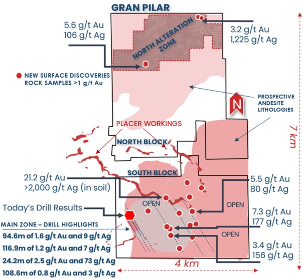 Erstmals konnte weit ausserhalb der Main Zone Lagerstätte eine neue Gold-Lagerstätte entdeckt werden. Im neu akquirierten Gran Pilar Expansionsgrundstück hat die allererste Bohrung erfolgreich hochgradiges Gold über beachtliche Längen durchschnitten: